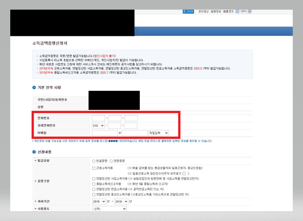 ▼ 홈택스 소득금액증명원 발급방법 3단계! [소득금액증명신청서] 작성 페이지에 접속한 다음에는 [전화번호]를 비롯한 [휴대전화번호] 그리고 [이메일] 등 [기본 인적 사항]에 해당하는 내용을 입력해준다.