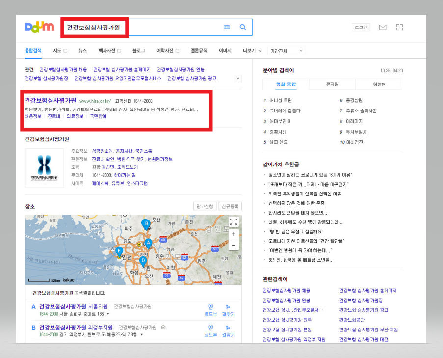 우선 다음이나 구글 혹은 네이버 등의 검색포털에 접속하여 검색창에다가 [건강보험심사평가원]을 입력한 뒤 검색해준다. 그런 다음 [건강보험심사평가원] 사이트를 클릭해준다.