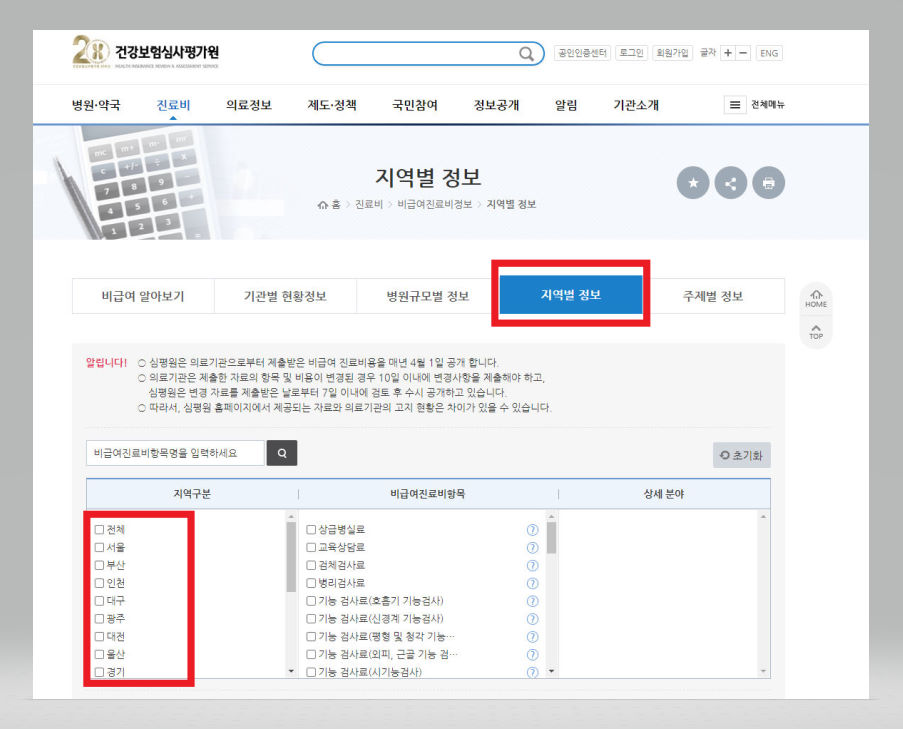 ▼ [병원규모별 정보] 메뉴뿐만 아니라 [지역별 정보] 메뉴를 통해서도 가격비교를 진행해볼 수가 있는데, [지역구분] 선택란을 통해 '서울'이나 '부산', '인천', '대구', '광주', '대전', '울산', 혹은 '경기' 등을 선택한 다음 절차를 진행해보아도 좋다.