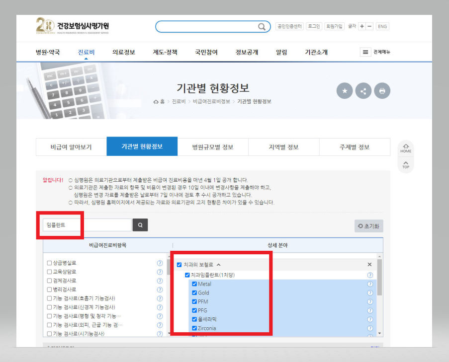 ▼ [비급여진료비항목명을 입력하세요] 입력란에 [임플란트]를 입력해준 후 그 옆에 있는 [찾기] 버튼을 클릭해준다.