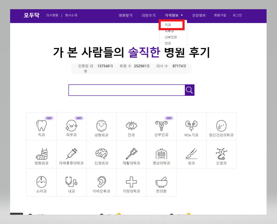▼ [가격정보] 메뉴에서 [치과] 버튼을 클릭해준다.