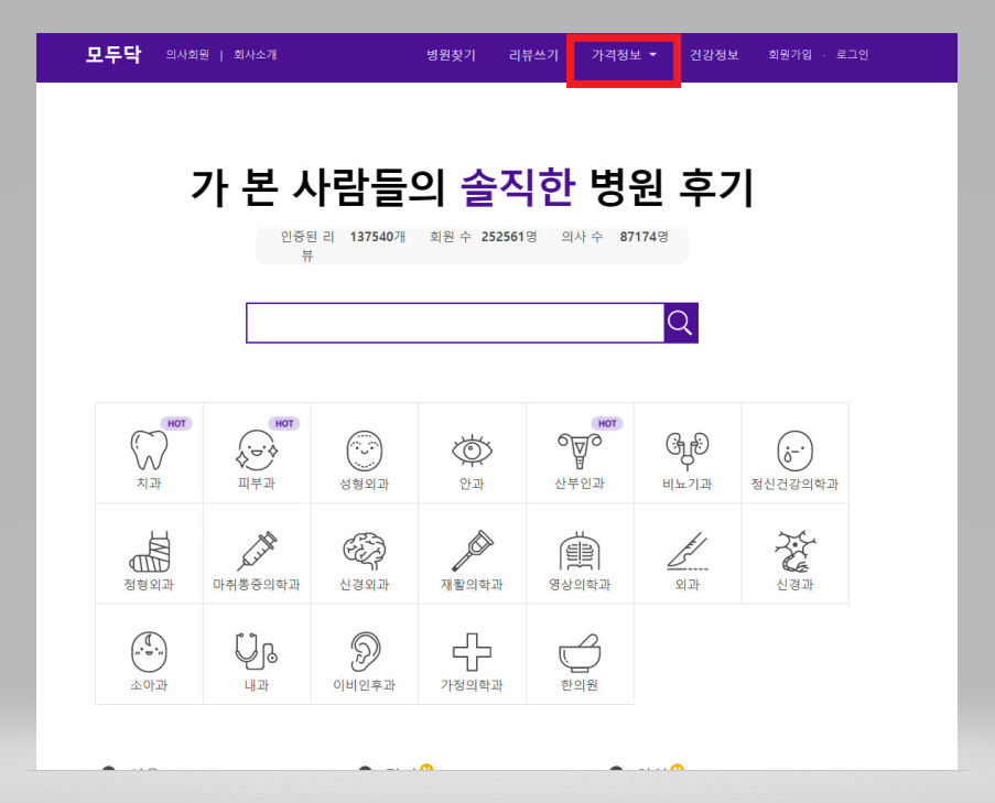 ▼ [모두닥] 사이트에서 상단에 있는 [가격정보] 버튼을 클릭해준다.