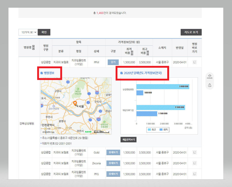 ▼ 해당 병원이 어디에 위치해 있는지와 대표자 번호 그리고 2020년 당해년도 가격정보(전국)까지 한 눈에 확인해볼 수 있다.