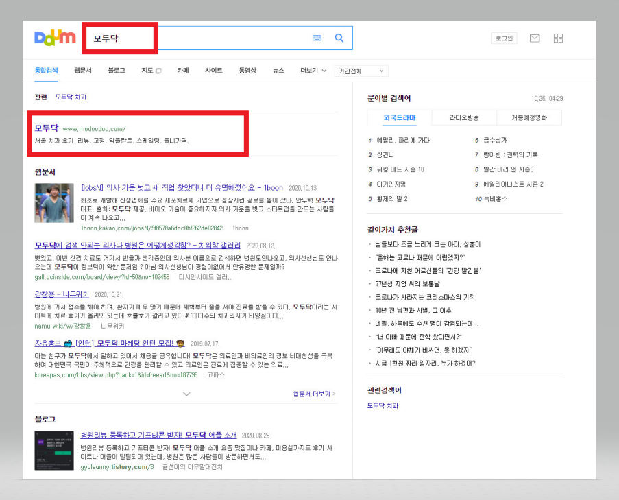 일단 다음이나 구글 혹은 네이버 등의 검색포털에 접속한 다음 [모두닥]을 검색하여 [모두닥] 사이트에 접속을 해주도록 한다.