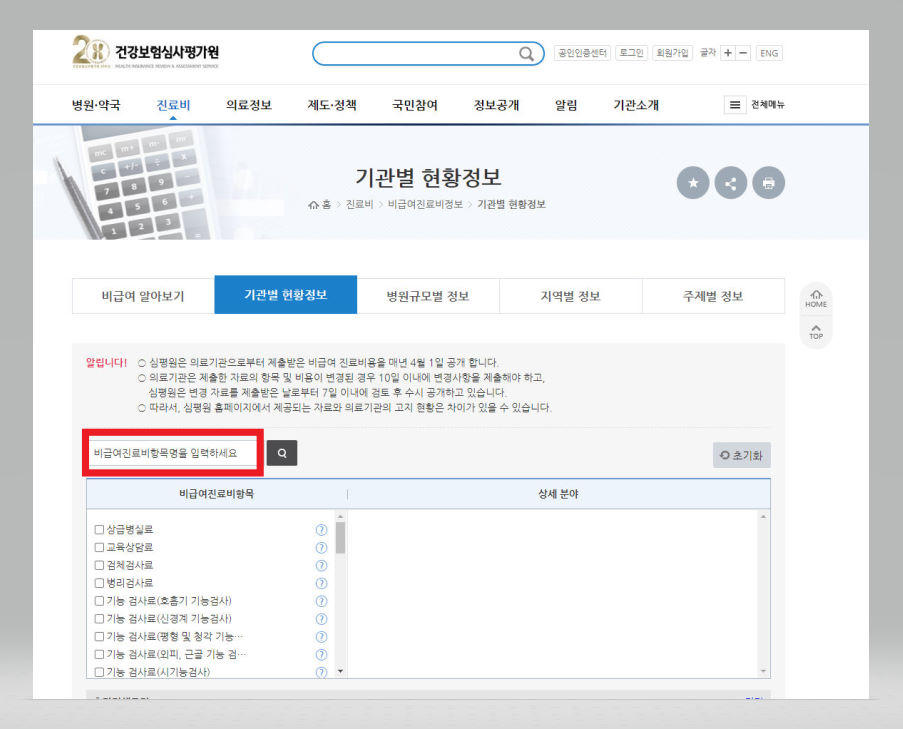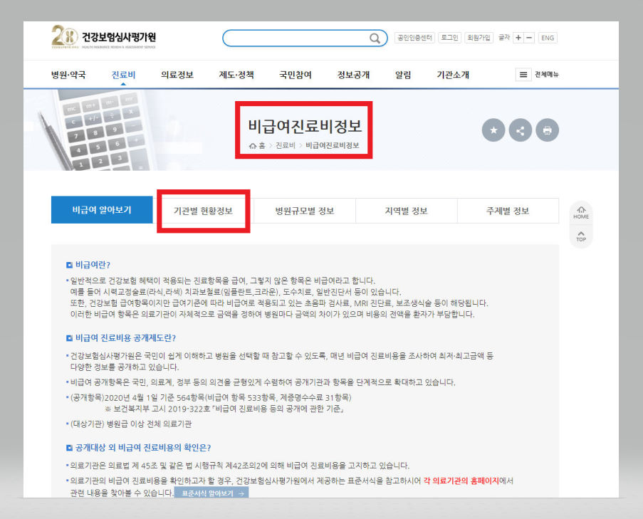 ▼ 그럼 [비급여진료비정보]가 나오는데 아래에 있는 [기관별 현황정보] 버튼을 클릭해준다.