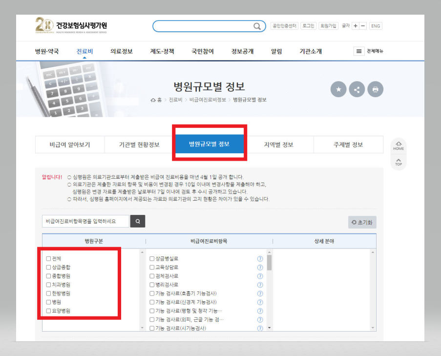 ▼ 지금까지는 [기관별 현황정보] 메뉴를 통해서 절차를 진행하였으나, 비단 [기관별 현황정보] 메뉴뿐만 아니라 [병원규모별 정보]를 통해서도 가격비교를 진행해볼 수 있다. [병원규모별 정보] 버튼을 클릭한 다음 [병원구분] 선택란을 통해 본인이 희망하는 병원이 '상급종합'인지 '종합병원'인지 '치과병원'인지 '한방병원'인지 그냥 '병원'인지 아니면 '요양병원'인지 선택해주도록 한다.
