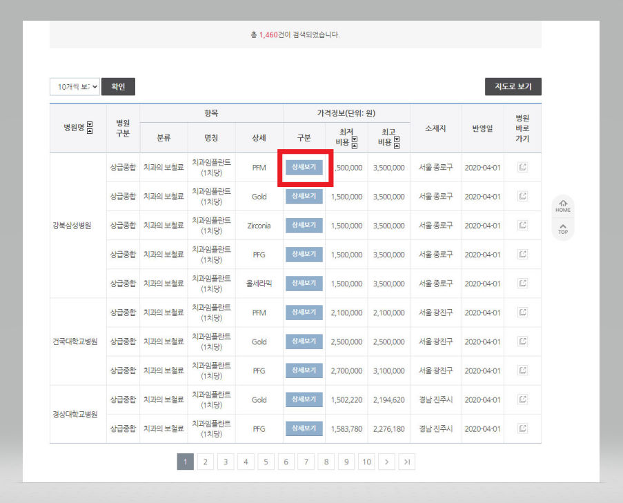 ▼ 그렇게 해서 나오는 병원별로 [최저비용]과 [최고비용]을 확인해볼 수 있으며, [소재지]와 [반영일]까지 확인해볼 수 있다. [상세보기]도 가능한데, 상세히 보기를 원한다면 [상세보기] 버튼을 클릭해주도록 한다.