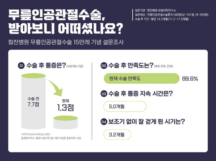 힘찬병원은 최근 무릎인공관절수술 15만례 돌파(2023년 8월 31일 기준 8개 지점 수술건수 총합)를 맞아 수술환자 500명을 대상으로 실시한 설문조사결과를 발표했다. 발표에 따르면 수술 약 1년 후 통증은 6배가량 줄고 수술 만족도는 90%에 달하는 것으로 나타났다.