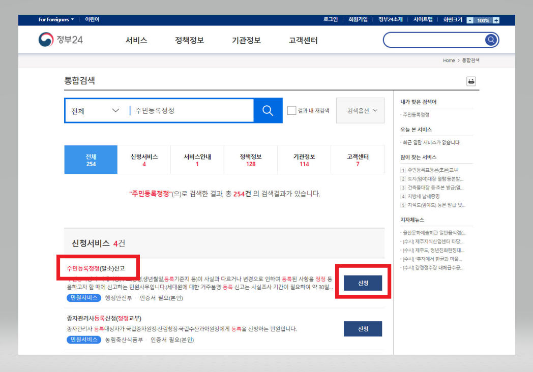 ▼ 그러면 아래에 [신청서비스]가 4건이 뜨는데, 맨 첫 번째에 나와 있는 [주민등록정정(말소)신고] 옆의 [신청] 버튼을 클릭해준다. 그다음 공인인증서를 통해 로그인 절차를 진행해주도록 한다.