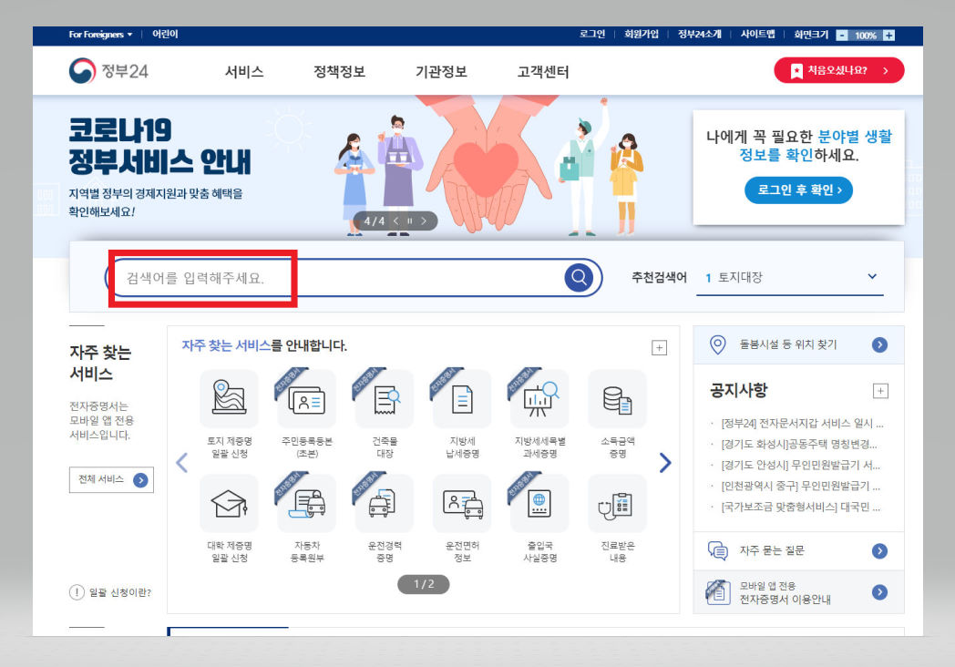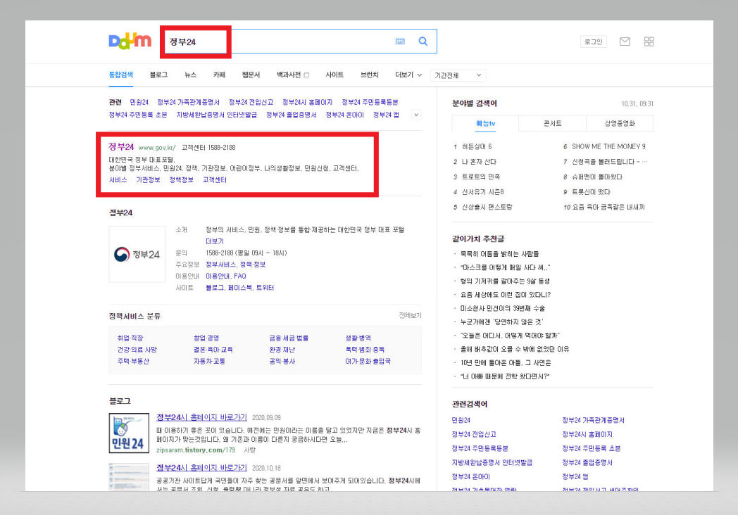 세대주 분리 방법 1단계! 우선 다음이나 구글 혹은 네이버 등의 검색포털에 접속한 다음 검색창에 [정부24]를 입력하여 검색해주도록 한다. 그다음 [정부24] 사이트에 접속해준다.