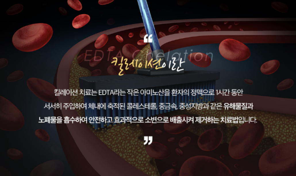 킬레이션치료는 Ethylene Diamine Tetraacetic Acid(EDTA)라는 작은 아미노산을 환자의 정맥으로 1 시간 동안 서서히 주입하는 것입니다.