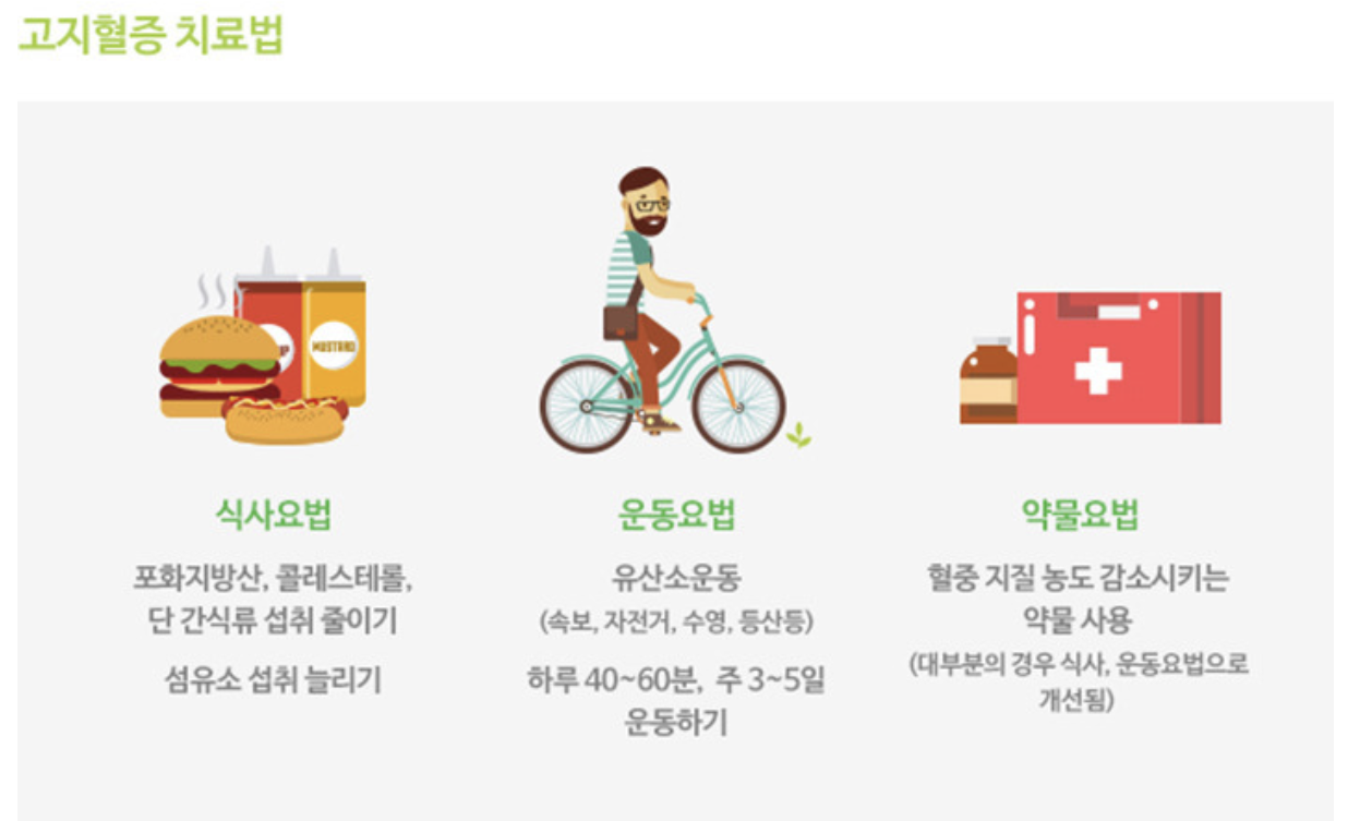 고지혈증을 치료하기 위해선 식단 조절과 적절한 운동이 모두 필요합니다. 콜레스테롤 섭취는 줄이고 섬유소 섭취는 늘리며, 하루 한 시간 정도 유산소 운동을 꾸준히 해주세요. 심한 경우 약물로 치료할 수도 있지만, 대부분의 경우 식단 조절과 운동으로 개선되니 너무 걱정하실 필요는 없습니다.