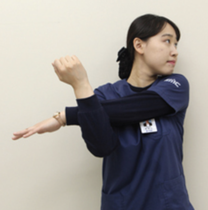 - 아픈 쪽 팔을 반대쪽 몸통 방향으로 쭉 편다.