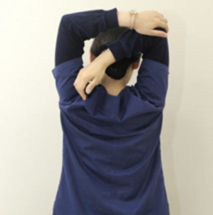 - 아픈 쪽 팔을 머리 뒤로 구부려 들어올린다.