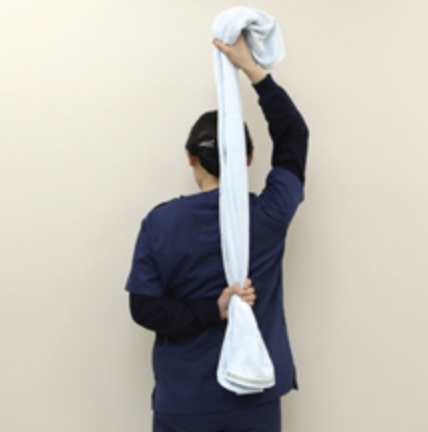 - 선 상태에서 수건을 등 뒤로 잡는다.