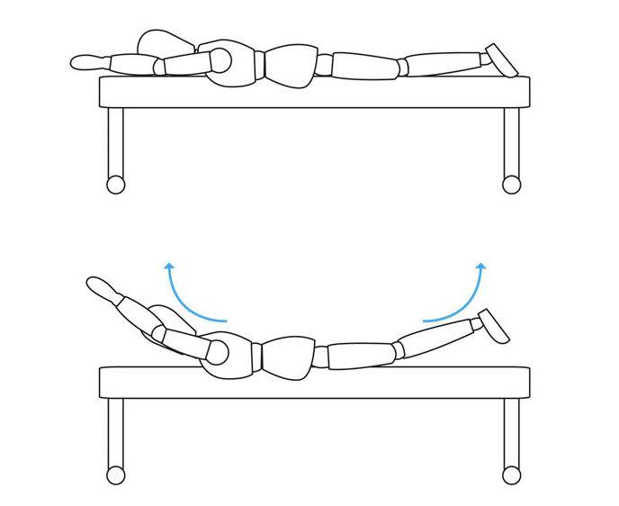엎드린 다음 슈퍼맨처럼 손을 위로 뻗는다. 숨을 들이마신 다음 천천히 내뱉으면서 팔과 다리를 위로 든다. 어깨는 힘을 빼고 엉덩이와 배에 힘을 준 상태에서 20초씩 3회 반복한다.