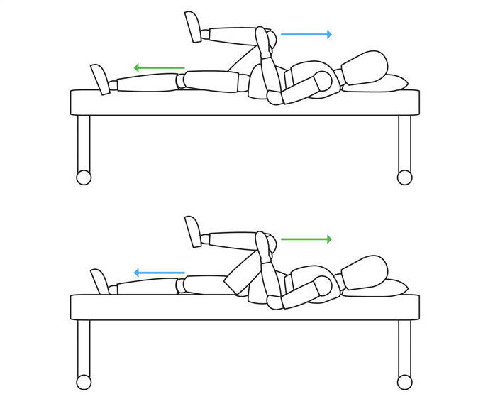 누운 상태에서 오른쪽 무릎을 왼손으로 잡고 왼쪽으로 누른다. 고개는 오른쪽으로 향한 채 30초간 유지한다. 약 3회 반복한 후 왼쪽 다리도 같은 방법으로 반복한다.
