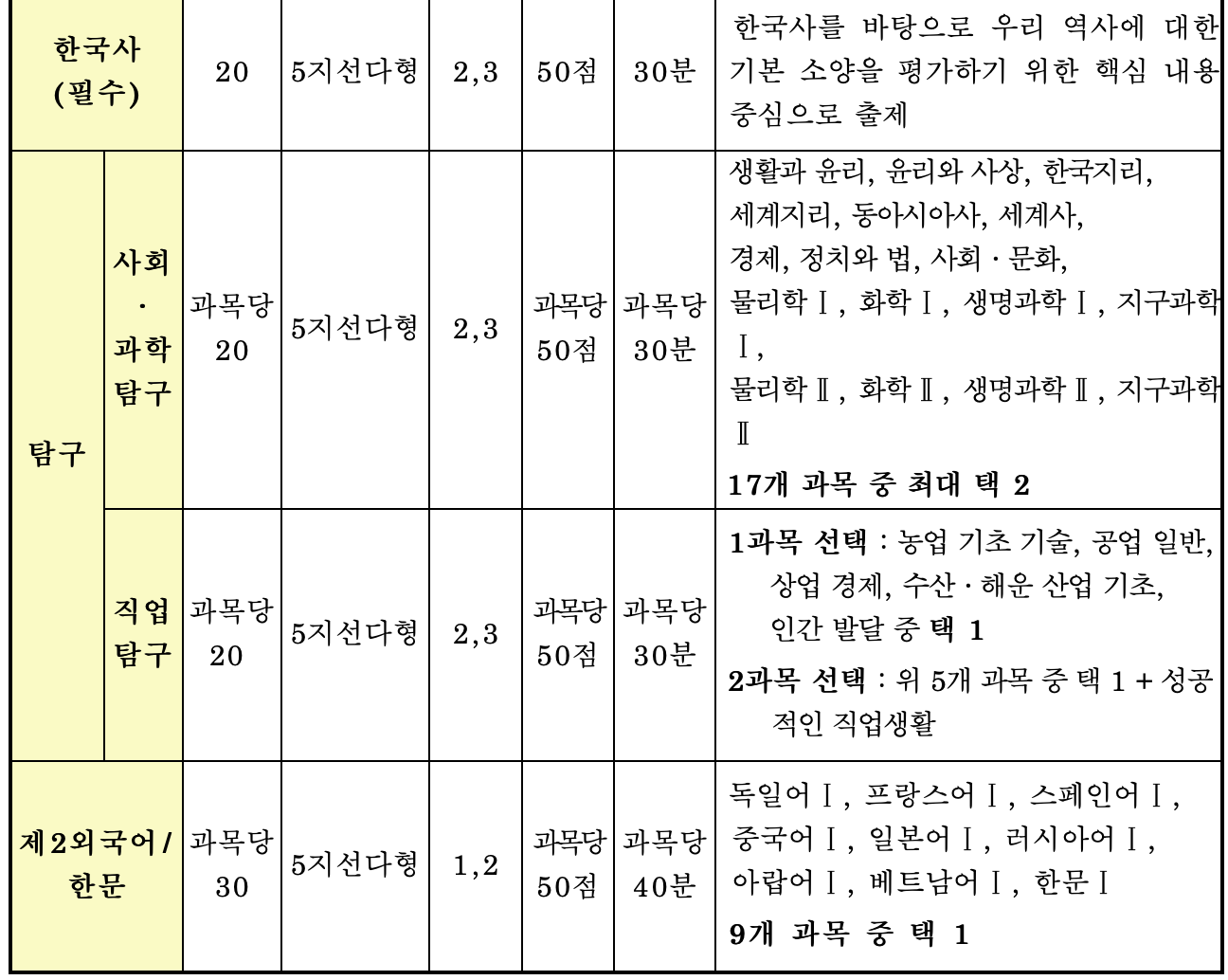 - 사회·과학탐구 영역 총 17개 과목 중 최대 2개 과목 응시