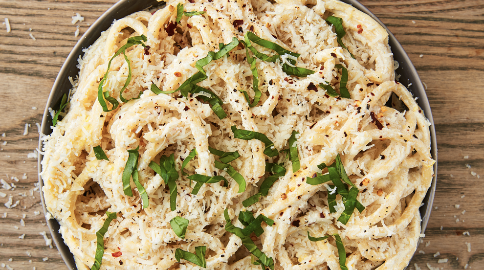 6) 완성된 파스타를 그릇에 옮겨 담고 치즈와 파슬리, 후추로 장식하면 완성.