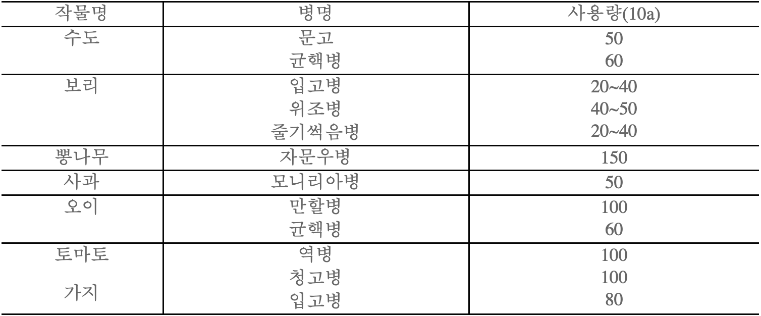 1958년에 농약으로 등록을 했습니다. 현재까지 농약등록의 상용은 표 -6에 있는 것과 같습니다. 그러나 실제로는 이 이외에 표7, 8과 같이 많은 병해충에 효과가 있는 것도 알려져 있습니다.