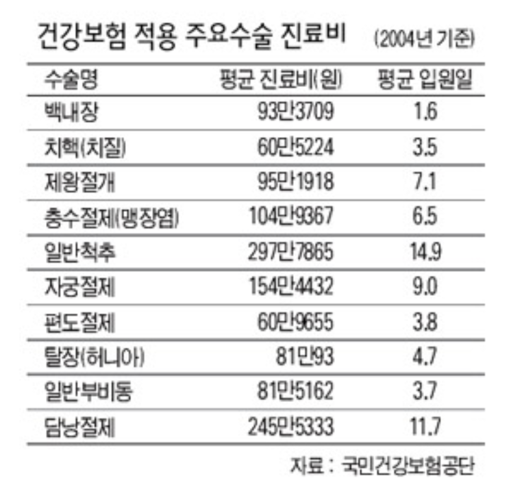 아래는 건강보험 적용 주요 수술 진료비(수술명/평균 진료비/평균 입원일)