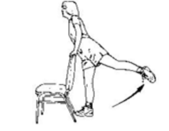 - 반대측 다리도 같은 방식으로 한다. 각 다리에 대해서 5회 반복. 너무 힘들다면 다리를 들 때 그림과 같이 반대측 다리의 무릎을 구부려 발로 바닥을 짚은 채로 한다.