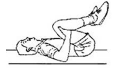 - 무릎을 가슴에 붙인다. 양손을 무릎 밑에 넣어서 부드럽게 최대한 가슴 쪽으로 당긴다. 이때 머리를 들지 않는다.