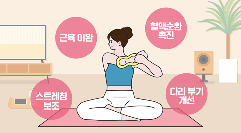 요가링은 근육을 감싸고 있는 근막의 순환이 잘 되지 않아 근육이 뭉친 경우 근막을 부드럽게 이완시켜 증상을 완화할 수 있으며, 다리 부기 개선, 혈액순환 촉진 등에 도움을 줍니다.