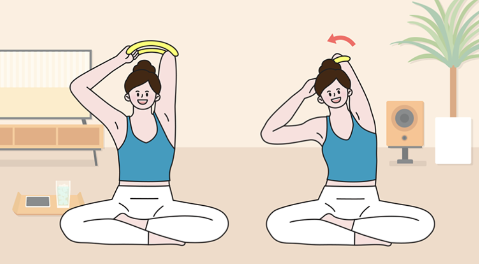 1) 의자 혹은 바닥에 바르게 앉은 후 팔꿈치를 들어 머리 뒤로 넘긴 후 요가링을 팔꿈치에 끼워줍니다.
