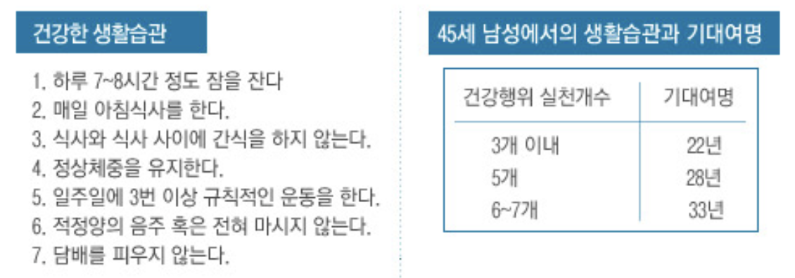 평균 나이 45세 남자를 기준으로 한 연구에서 45세 남성이 건강한 생활습관 중에서 6개 이상을 한다면 78세 정도가 기대 수명인데 반하여, 3개 이하인 경우는 67세 정도가 기대 수명이 되어 생활습관에서 세 가지 정도 차이가 있어도 기대 수명에서 11년의 차이가 난다.