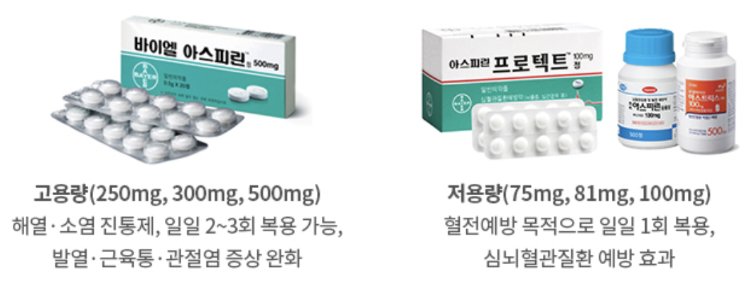 저용량(75mg, 81mg, 100mg): 혈전예방 목적으로 일일 1회 복용, 심뇌혈관질환 예방 효과