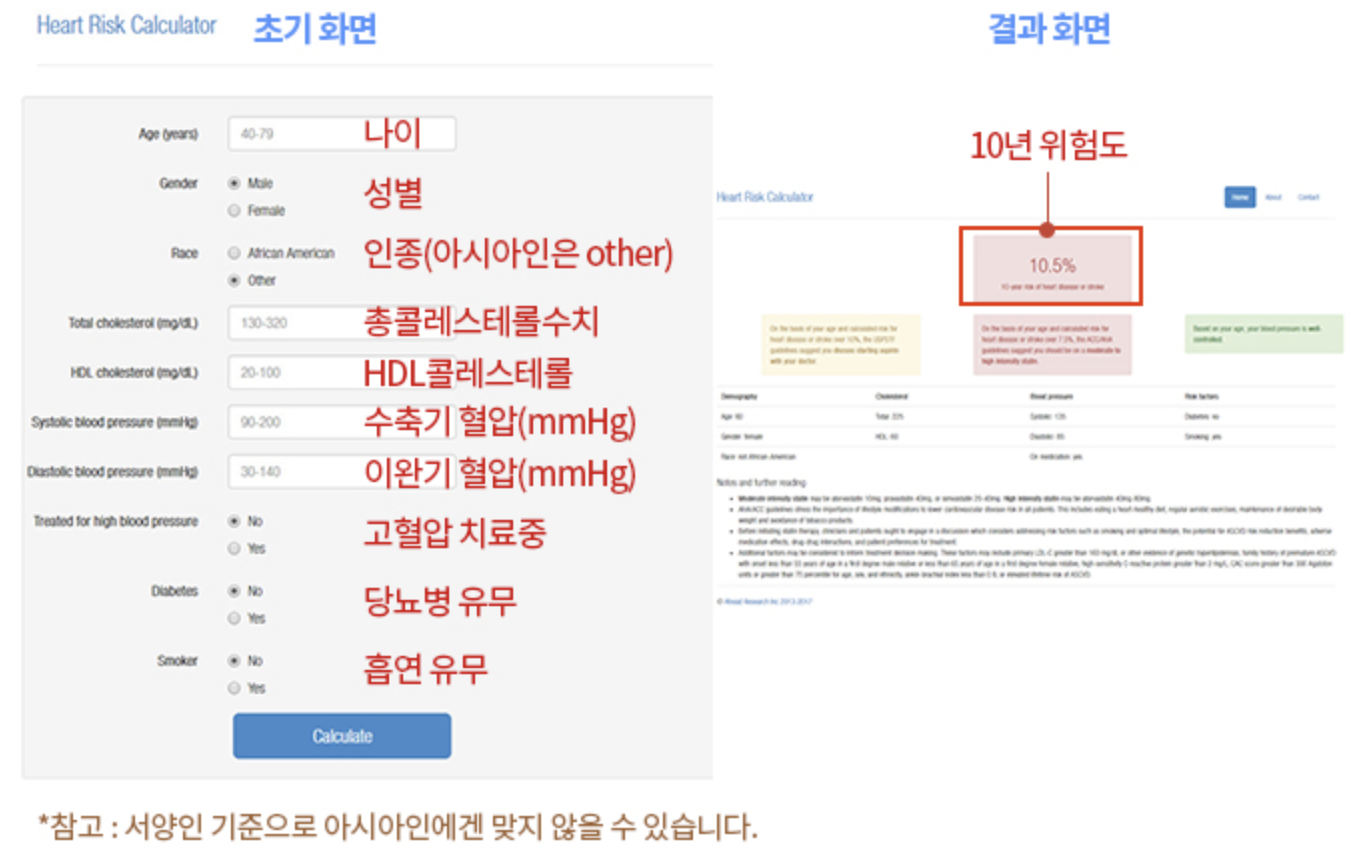 단, 이런 계산기는 모두 서양인을 기준으로 만들어져서 한국인을 비롯한 아시아인에게는 맞지 않을 수 있습니다. 따라서 고위험군에 속한다고 무조건 저용량 아스피린을 먹지 말고 의사와 상담 후 복용 여부를 결정하는 게 좋습니다.