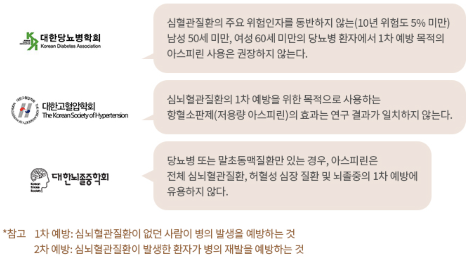 3. 국내 주요 학회는 혈관 질환 예방을 위해 모두에게 아스피린 복용을 권하지 않습니다
