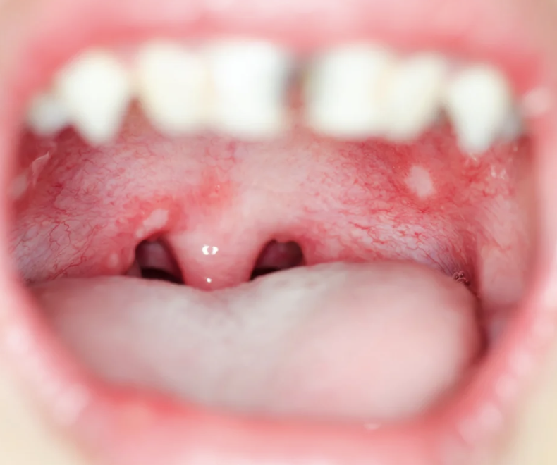 2) 혀나 혀 밑, 입천장이나 뺨 안쪽에 붉은 색의 반점들이 보임.