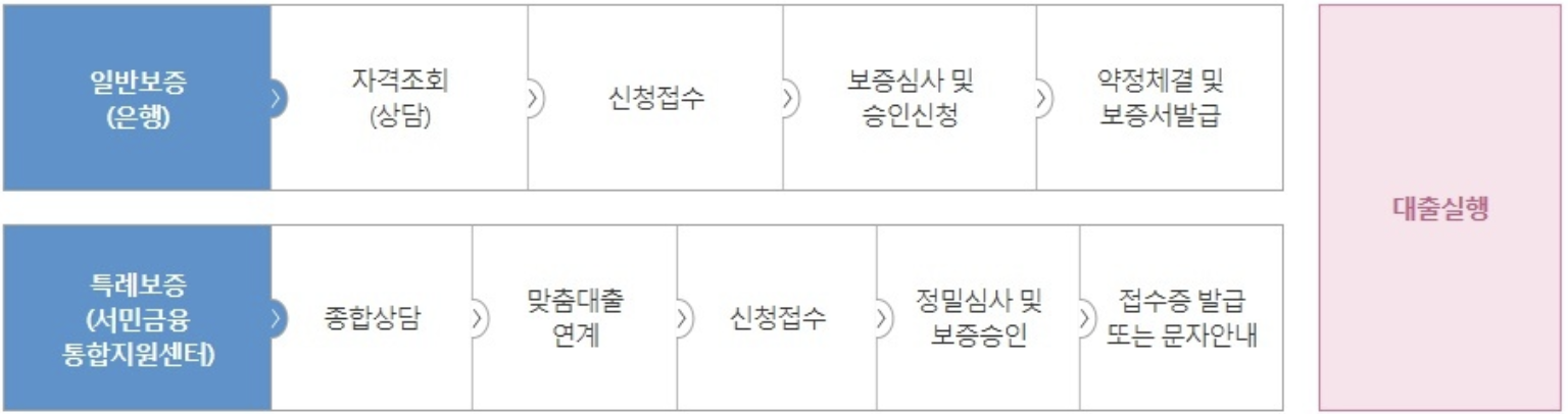 일반보증(은행): 자격조회(상담) - 신청접수 - 보증심사 및 승인신청 - 약정체결 및 보증서발급 - 대출실행