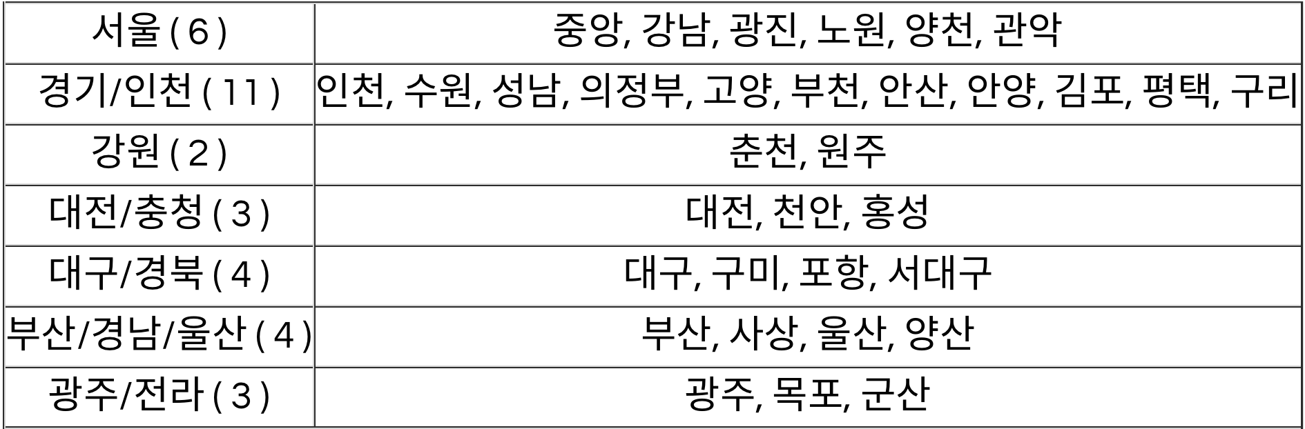 경기/인천(11): 인천, 수원, 성남, 의정부, 고양, 부천, 안산, 안양, 김포, 평택, 구리