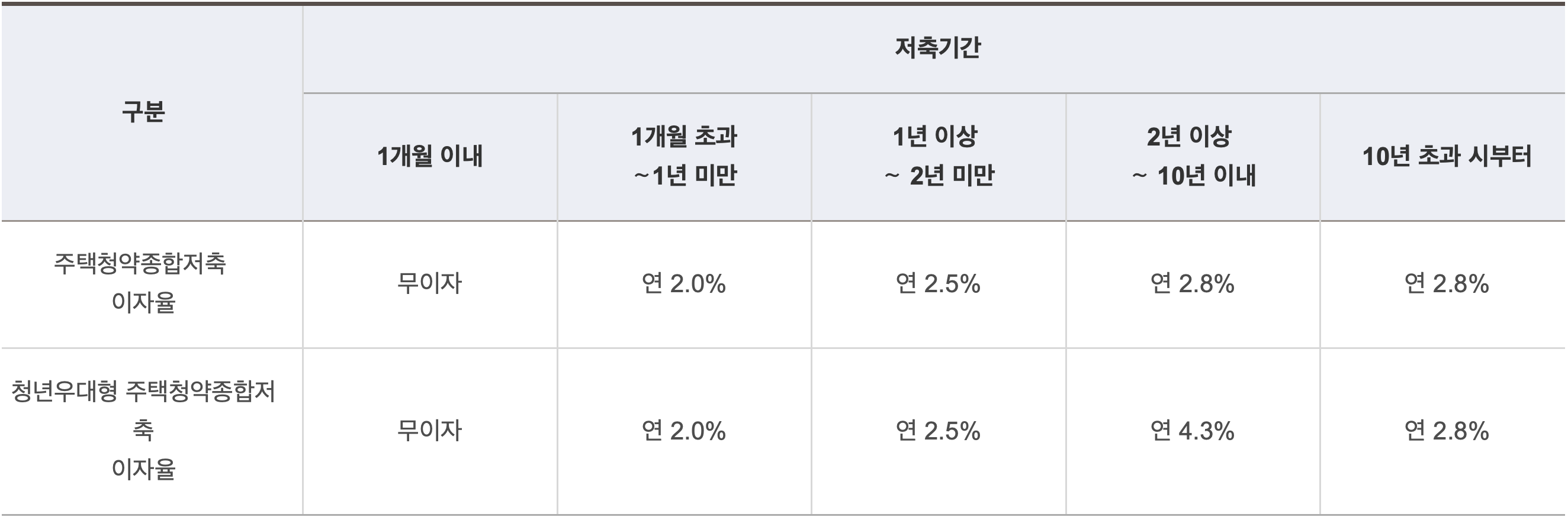 * '청년우대형 주택청약종합저축' 우대이율은 가입기간 2년 이상일 경우 무주택기간에 한하여 적용(가입일로부터 10년 이내의 기간), 단 가입기간 2년 미만이더라도 주택공급에 관한 규칙에 따라 주택공급에 청약하여 당첨된 자가 당첨을 사유로 해지하는 경우 우대이율 적용