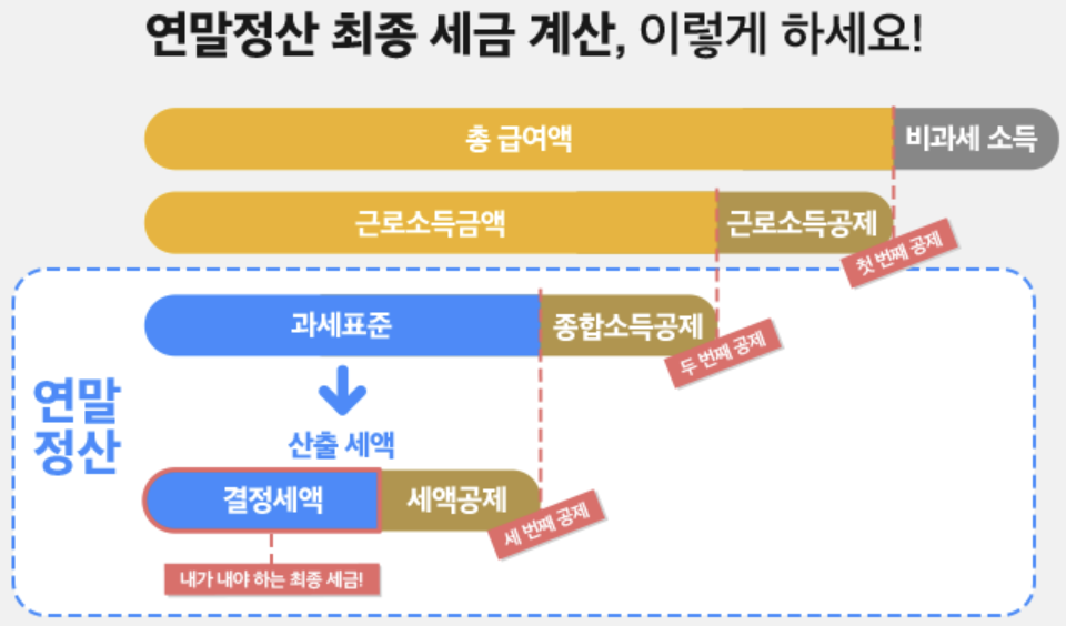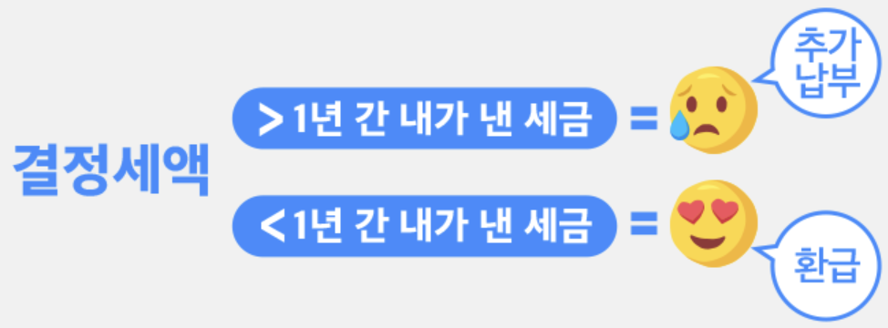 연말정산을 한다고 무조건 환급액을 돌려받는 건 아니에요. 앞서 설명한 소득 추정치를 기준으로 세금을 걷어가는 ‘원천징수’를 기억하시죠? 연말정산은 이미 낸 세금(원천징수)과 결정세액 즉 최종 세금을 비교하는 과정이예요. 이미 낸 세금이 결정세액보다 많다면 환급받고, 반대로 결정세액보다 적다면 추가로 세금을 내야 하죠.
