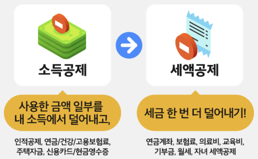중요한 점이 한 가지 더 있어요. 바로 소득공제와 세액 공제의 차이입니다. 소득공제는 세율을 곱하기 전 단계의 소득 금액을 줄여주는 것이고, 세액공제는 세율을 곱해서 나온 세액에서 일정한 금액을 줄여주는 것입니다. 그래서 공제 효과가 조금 달라요. 같은 소득공제라도 소득 금액이 높아 더 높은 세율을 적용받는 사람일수록 세금은 더 많이 줄어들죠. 그래서 일반적으로 종합소득공제는 소득이 많은 사람이 몰아서 받는 게 더 유리하다고 해요.