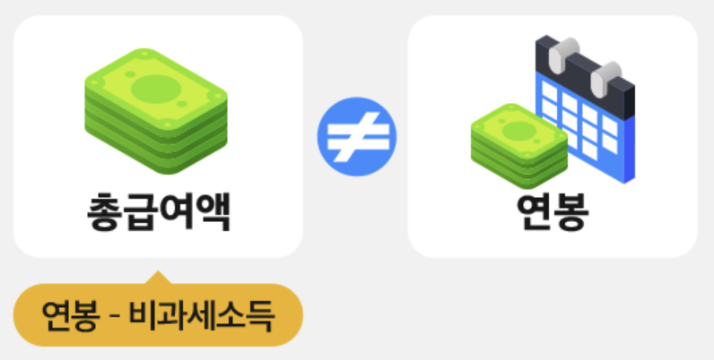 반면 총 급여액은 연봉에서 위에서 말한 식대나 보육 수당 같은 ‘비과세 소득’을 뺀 금액을 말합니다. 비과세 소득이란 말 그대로 세금을 부과하지 않는 소득이에요. 따라서 연말정산에서는 세금을 부과하는 소득인 총 급여액을 기준으로 각종 공제액을 정합니다.