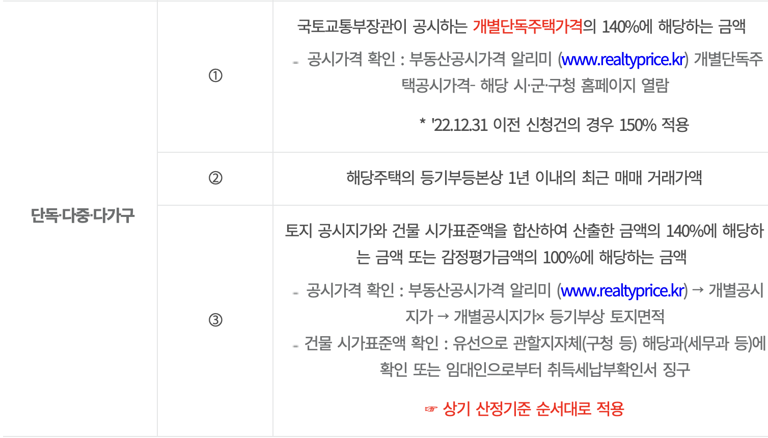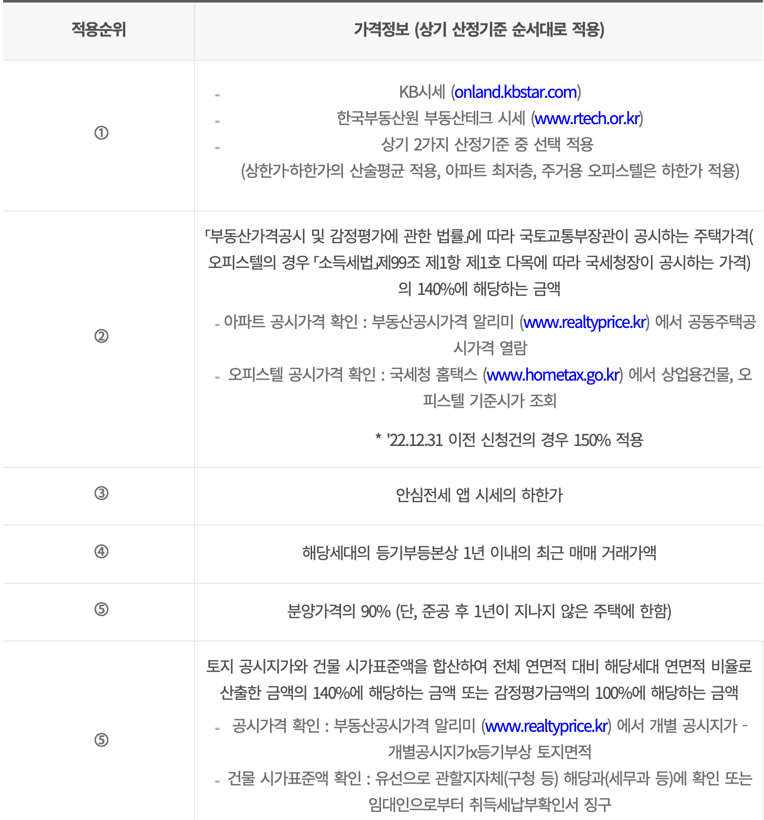 - 주택가격은 보증승인일 현재의 ‘가격정보 순서’로 적용