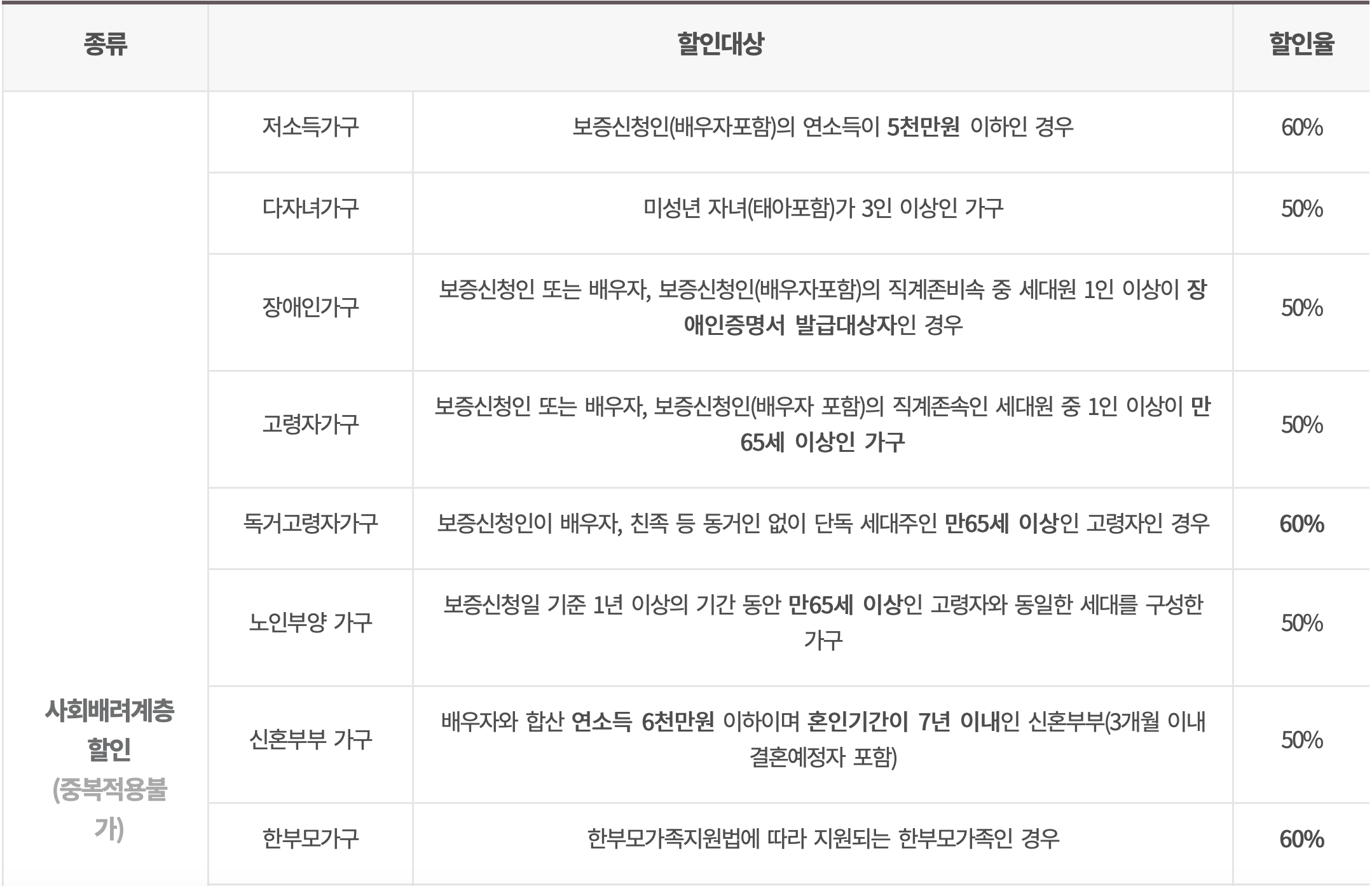 - 부채비율 할인: 선순위채권금액과 전세보증금을 합산한 금액이 주택가액의 60% 이하인 경우, 산출된 보증료의 10%를 할인