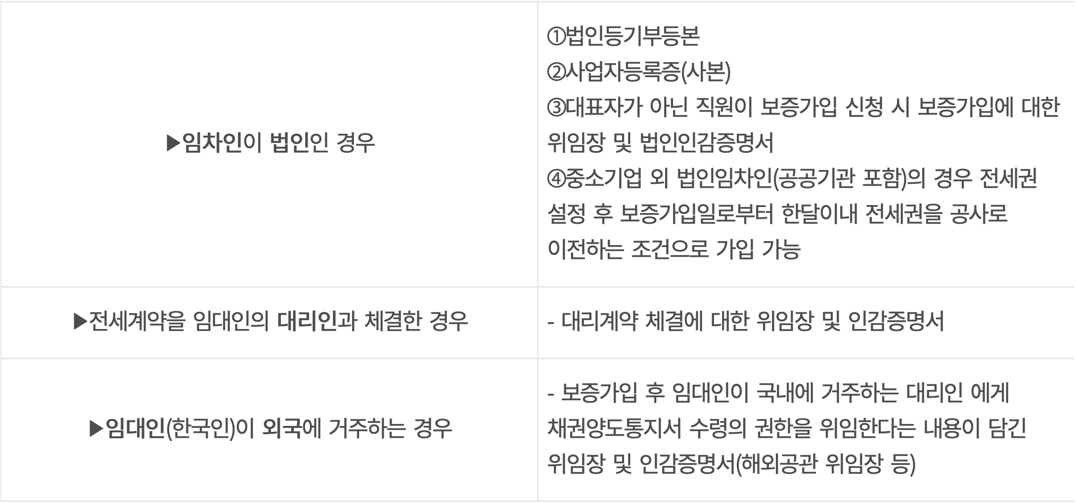 ※ 개인, 법인, 외국인도 보증가입이 가능합니다. 단, 중소기업이 아닌 법인의 경우 전세권을 공사에 이전하는 조건으로 가입 가능합니다.