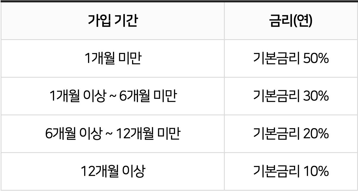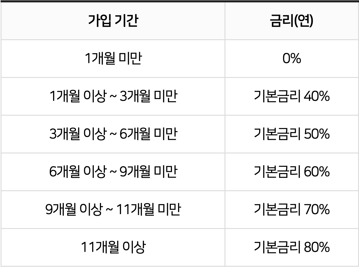 * 중도해지이율 = 기본금리 X 구간별 적용비율 X (경과월수/계약월수)
