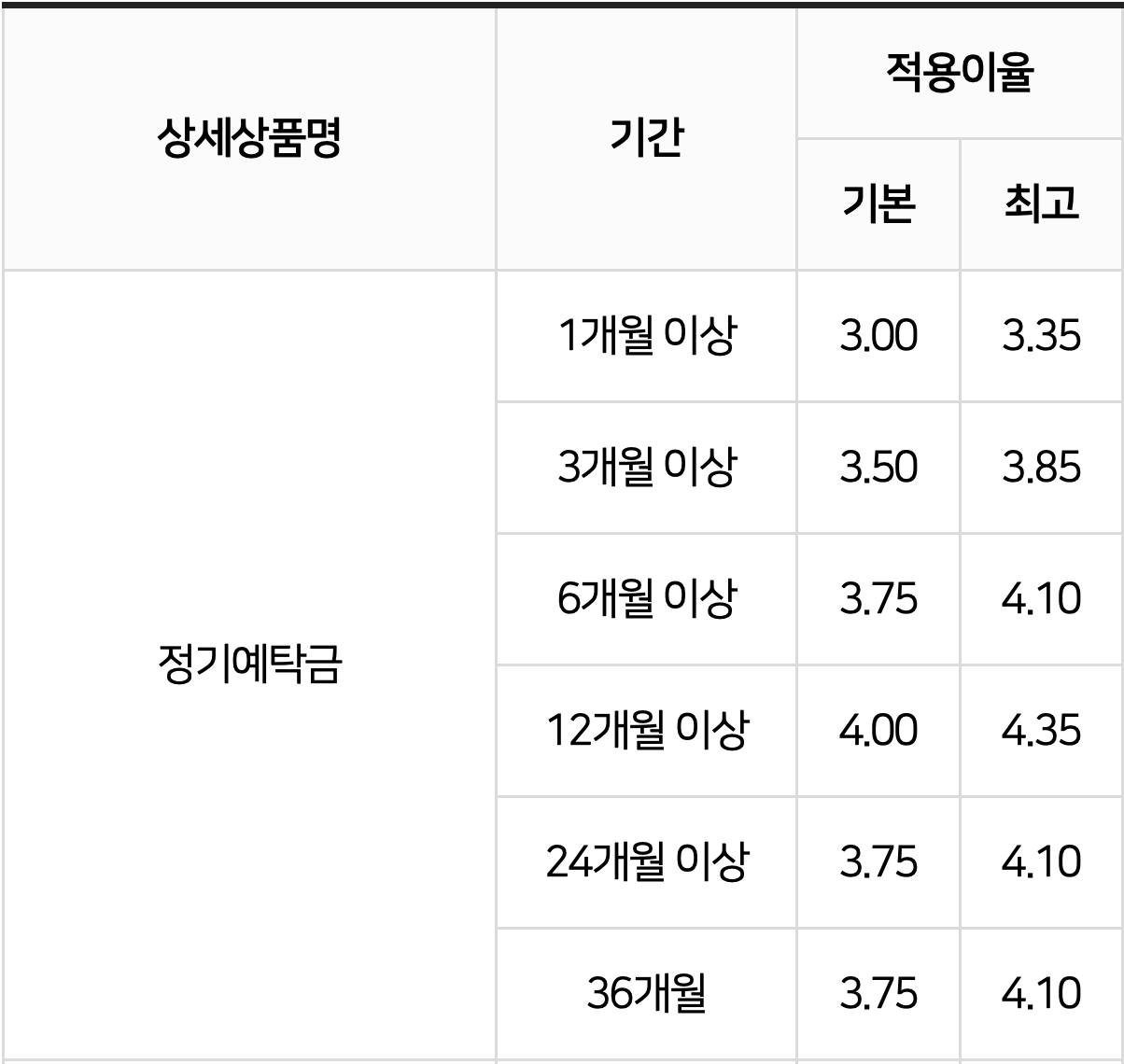 정기예탁금(1개월 이상, 3개월 이상, 6개월 이상, 12개월 이상, 24개월 이상, 36개월)