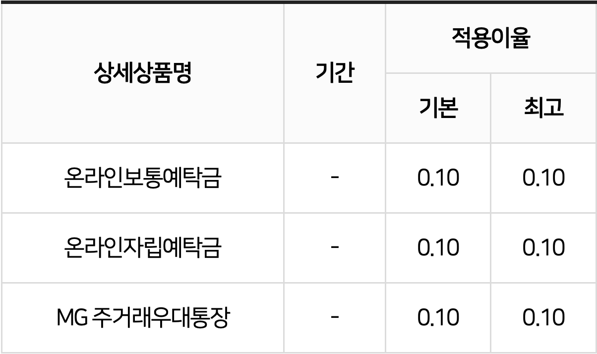 온라인보통예탁금, 온라인자립예탁금, MG 주거래우대통장(적용이율 - 기본/최고)