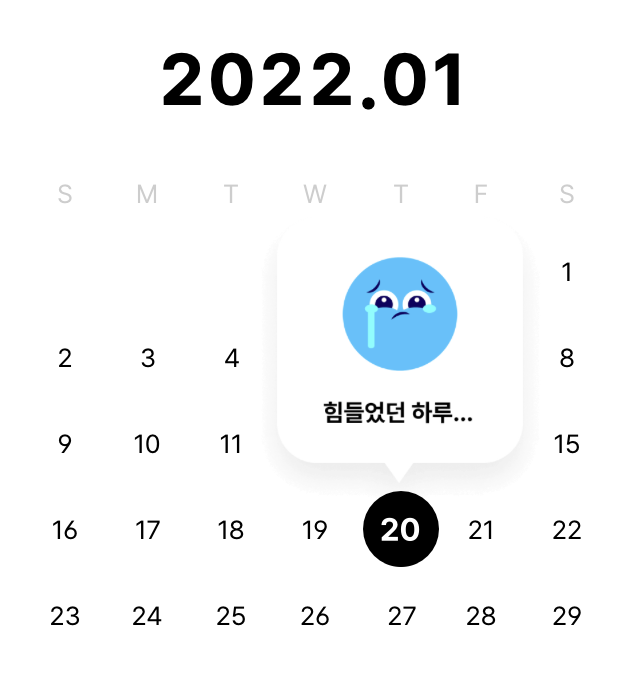 나의 감정을 이모지로 표현해요. 오늘의 감정에 꼭 알맞은 귀여운 감정 이모지를 찾아보세요. 이모지와 함께 메시지를 적어 오늘 하루를 기록할 수 있어요.