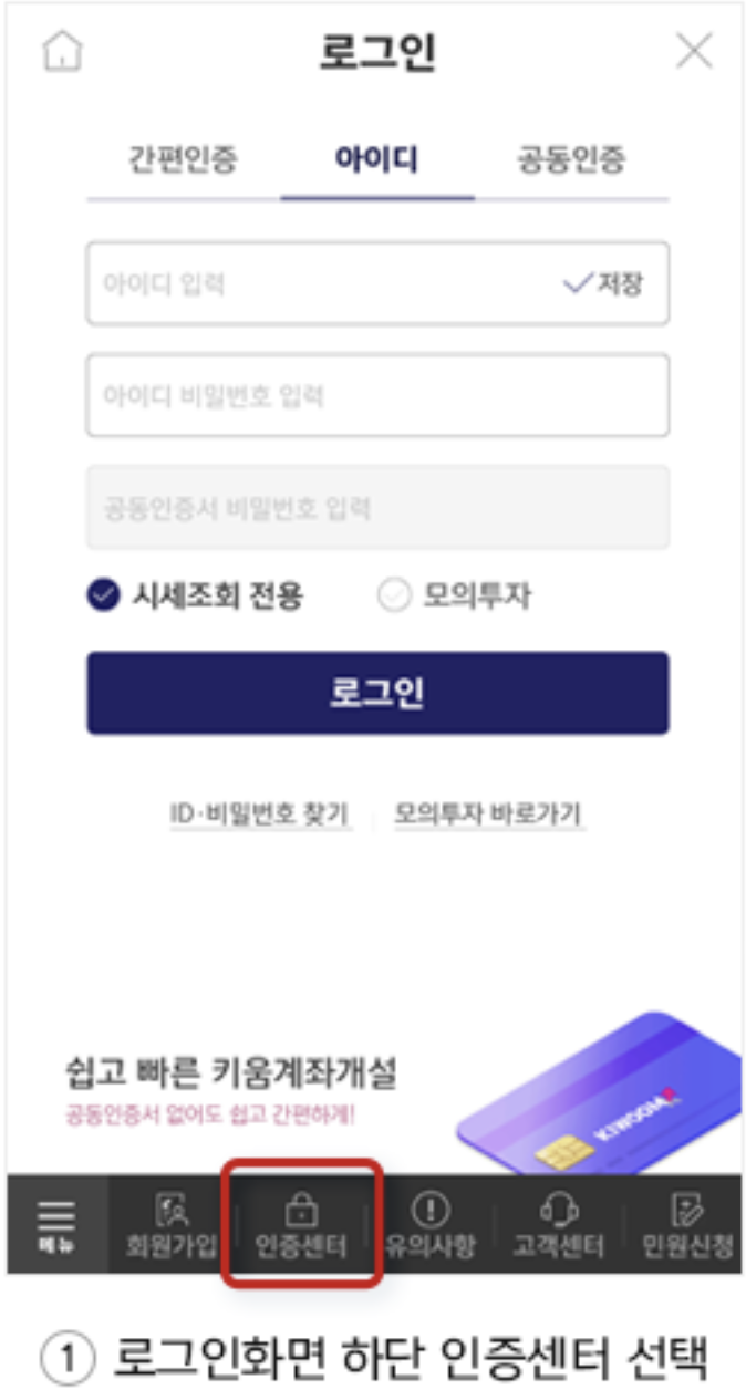 1) 로그인화면 하단 인증센터 선택