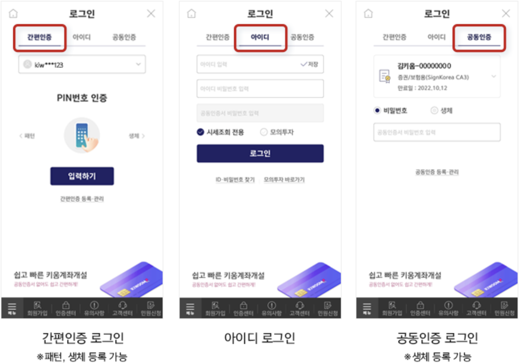 1) 간편인증 로그인 (* 패턴, 생체 등록 가능)