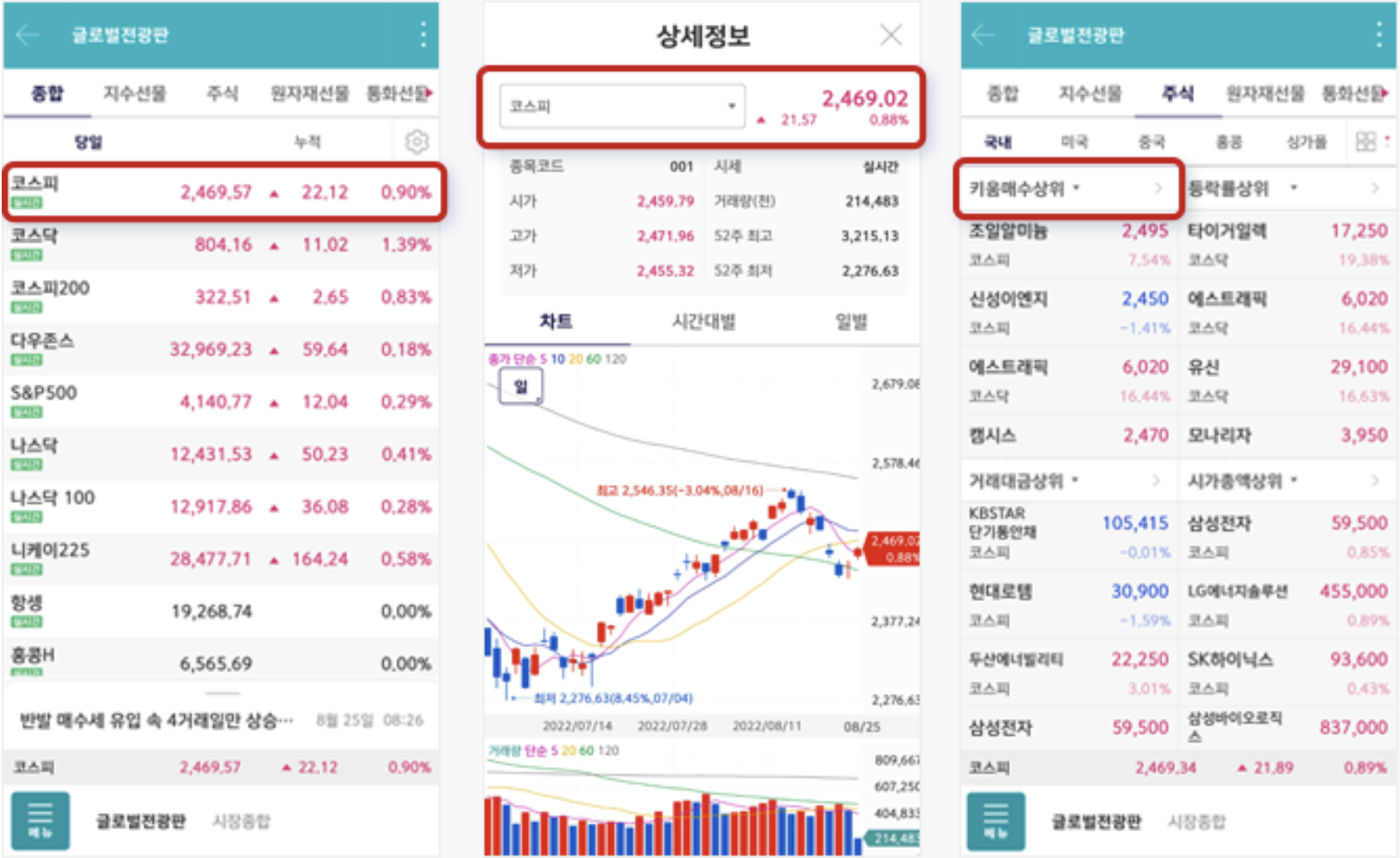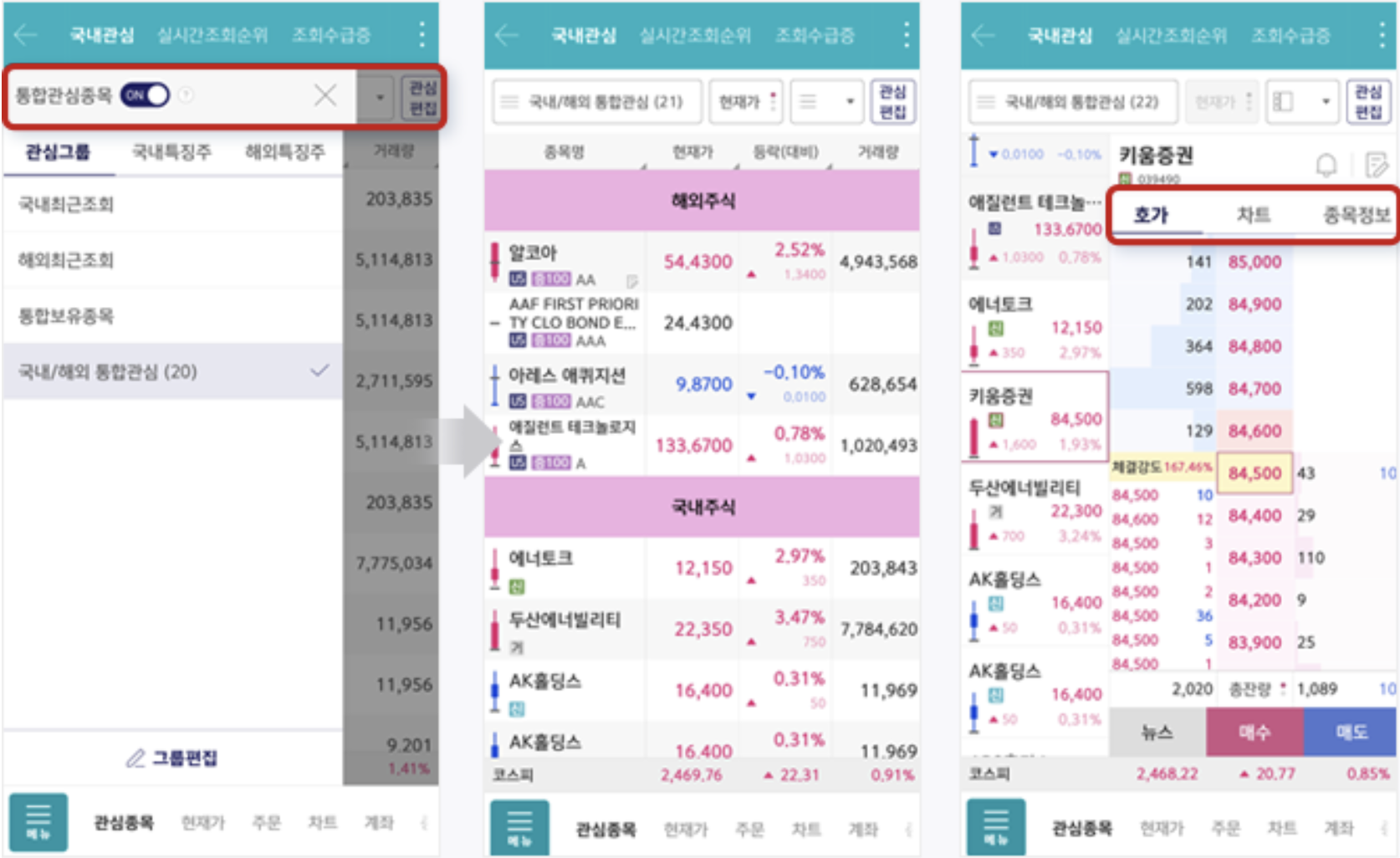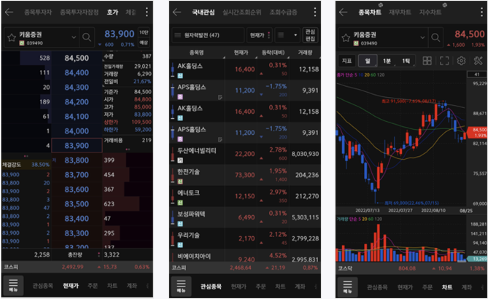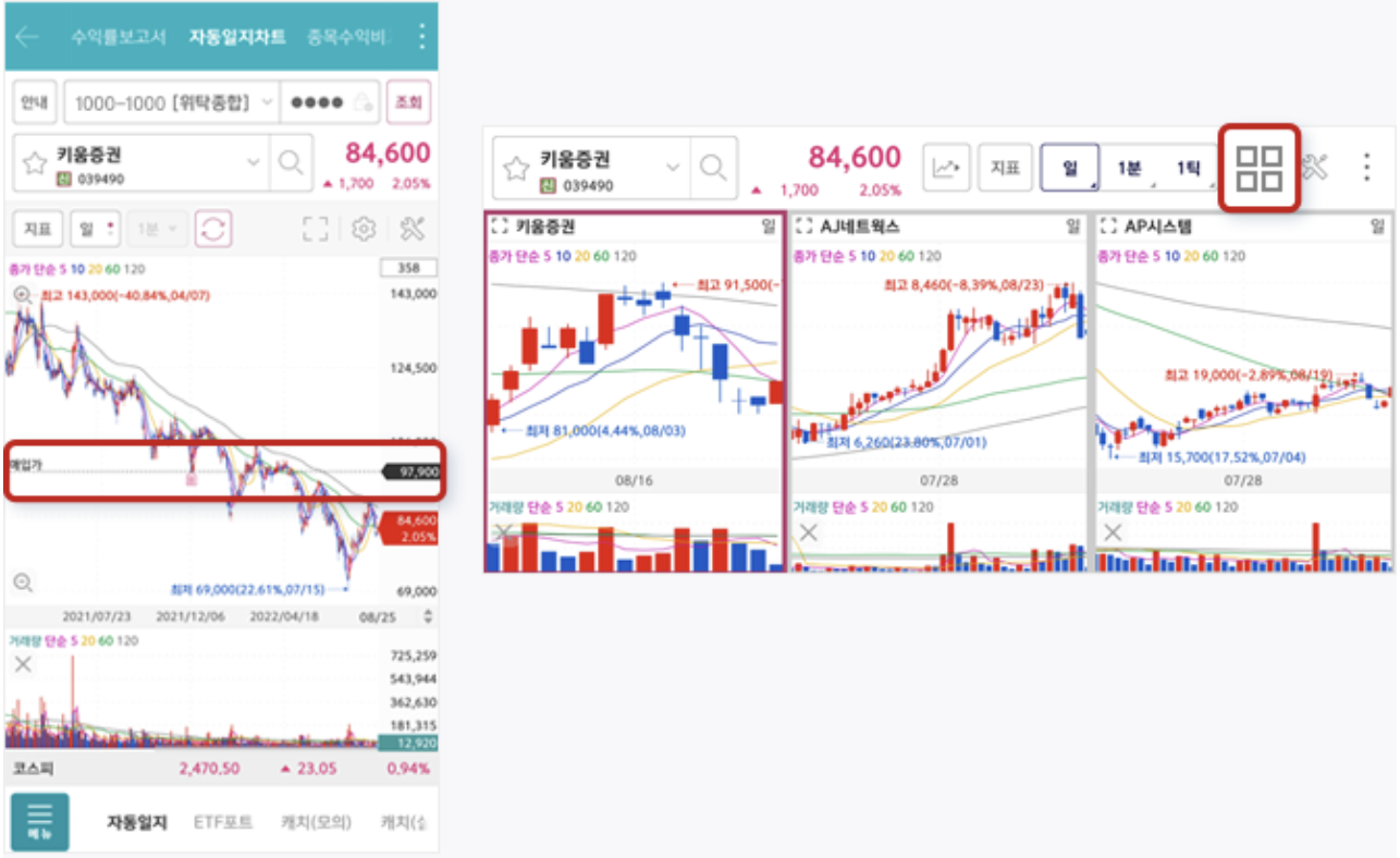 - 한 화면에서 관심종목의 호가/차트/종목정보 확인 가능